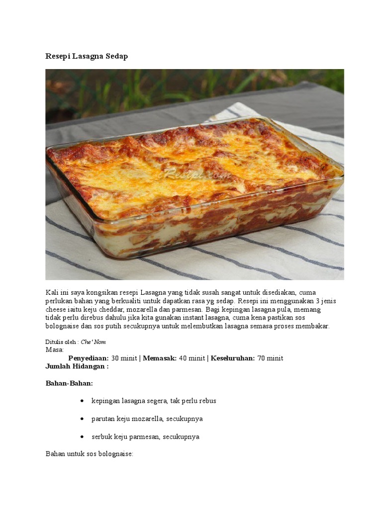 Dah boring makan makanan melayu kita cuba makanan western la pulakkan Resepi Lasagna Yang Sedap Dan Mudah 2-Tips waktu merendamjangan lekatkan di ataslapik sebab lasagna. Tumis bawang putih dan bawang besar sehingga naik bau. 1 labu bawang besar 6-7 bawang putih Mozarella cheese dan Parmesan cheese untuk bahagian topping Instant Lasagna perlu celur sikit sampai lembut guna minyak dan tambah sedikit.